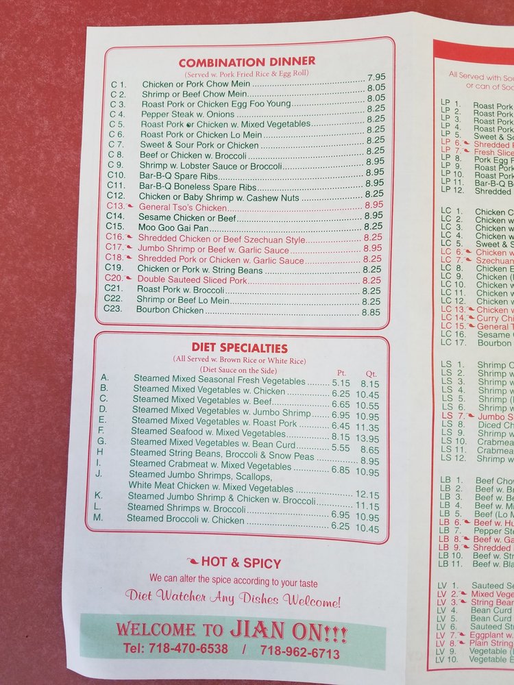 Welcome to Jian On Restaurant, your friendly neighborhood spot for authentic Chinese cuisine in Glen Oaks, NY. Known for its quick service and fresh ingredients, this restaurant has cultivated a loyal following since its inception. The menu is a delightful mix of traditional and popular dishes, including savory lunch specials, fried chicken wings, and their famous sweet plantains.